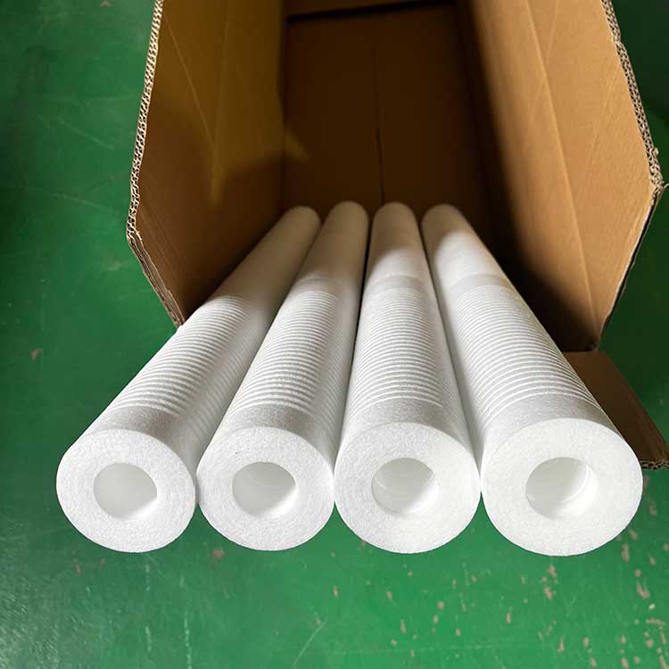 (2)過濾阻力小,濾流量大、納污量大、使用壽命長,本品在生產過程中纖維直徑及間隙可調,濾芯微孔內層小外層大,增大了流量和納污量,濾芯不易阻塞,延長使用壽命。